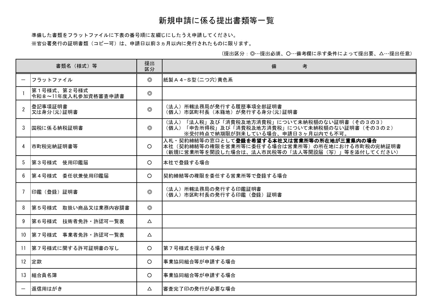 令和8年度以降各共同受付参加団体の「入札参加資格者名簿」への新規登録を希望される方は、下記の提出要領等に基づき申請を行ってください。
